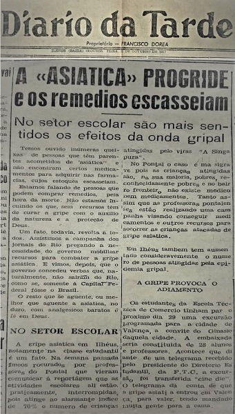 Leia no artigo o que aconteceu no BRASIL na década de 1950. O País completamente despreparado para enfrentar A GRIPE ASIÁTICA. Observe que, até o nome é da ÁSIA. As desgraças vêm sempre de fora. Matéria publicada no DIÁRIO DA TARDE, edição de 21-10-1957.