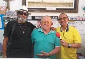 JOSÉ LEITE ladeado pelo amigo PADRE JOÃO OITICICA (lado esquerdo) e o amigo QUINTO DE SOUZA entrevistando JOSÉ LEITE na RÁDIO ILHÉUS TURISMO FM MUSICAL. (Foto: 14-11-2019).