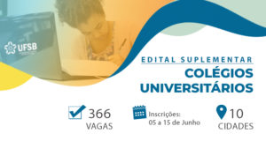 A Universidade Federal do Sul da Bahia lançou mais um edital de ingresso. Dessa vez, o edital é uma suplementação do Processo Seletivo para os Colégios Universitários e oferece 366 vagas para os municípios de Coaraci, Eunápolis, Ibicaraí, Ilhéus, Itabuna, Itamaraju, Porto Seguro, Posto da Mata, Santa Cruz Cabrália e Teixeira de Freitas.