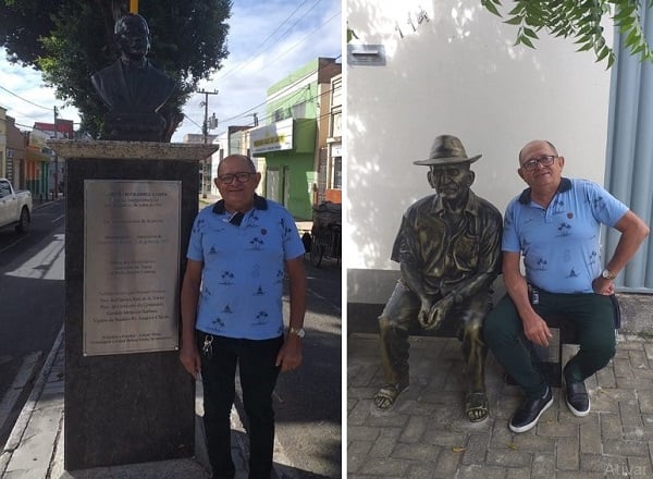 Quem aparece na foto acima é o amigo de JOSÉ LEITE, ADEVALDO GOMES VIANA, mais conhecido como NEGO DÉ, proprietário da LOJA ILHÉUS IMPORTADOS. NEGO DÉ foi passar o SÃO JOÃO em JUAZEIRO DO NORTE e mandou para JOSÉ LEITE essas duas fotos acima. Primeira foto ao lado do Busto de Dr. FLORO BARTOLOMEU DA COSTA, doado por JOSÉ LEITE ao Município na Comemoração do Centenário em 22-07-2011. Na segunda foto, sentado ao lado da Estátua de SEU LUNGA, inaugurada em 14-03-2020.