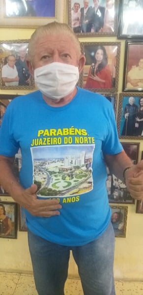 JOSÉ LEITE comemorando os 109 ANOS DE JUAZEIRO DO NORTE, vestido numa CAMISA com a foto da Cidade.
