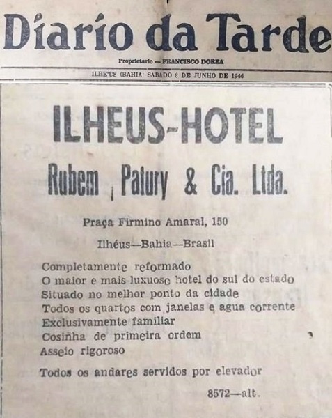 O ILHÉUS HOTEL foi inaugurado na década de 1930. O gigantesco Prédio foi construído a mando do Coronel MISAEL TAVARES. Com o correr do tempo, o HOTEL foi arrendado a várias pessoas, entre elas, Dona ELVIRA MENDONÇA e RUBEM PATURY. Observe as fotos acima da edição do JORNAL DIÁRIO DA TARDE com datas de 29-10-1938 e 08-06-1946 respectivamente.