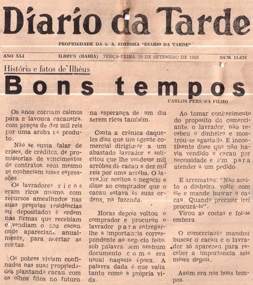 Prezado amigo, leia esse artigo acima com bastante atenção e saiba como se faziam alguns negócios de compras de CACAU naquele tempo de 80 anos atrás. Atualmente as vendas são com DINHEIRO ANTECIPADO. BONS TEMPOS AQUELE! Edição do JORNAL DIÁRIO DA TARDE de 10 de setembro de 1968.