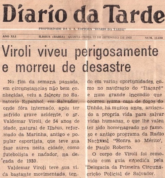 Algumas vezes já falamos sobre o cidadão VALDEMAR VIROLI, conhecido por VAVÁ VIROLI, mas muita gente não sabia o que tinha acontecido com ele depois que sumiu de ILHÉUS. A notícia acima saiu na última página do JORNAL DIÁRIO DA TARDE, edição de 12-09-1968. Clique na foto para ampliar!