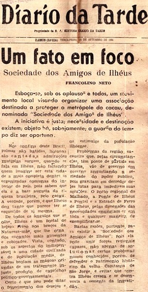 Algumas Entidades são criadas em ILHÉUS para engrandecer nas reinvindicações em benefício da cidade. Tem umas que até hoje sobrevivem “entre trancos e barrancos” e outras não. Um exemplo foi a “SOCIEDADE AMIGOS DE ILHÉUS”, que teve o apoio do saudoso Professor e advogado Dr. FRANCOLINO NETO, mas infelizmente demorou pouco tempo (observe foto acima). Outra que não foi pra frente: O FÓRUM PERMANENTE EM DEFESA DE ILHÉUS. No final é a cidade quem sai perdendo. Foto: Edição do jornal DIÁRIO DA TARDE de 15 de setembro de 1964. Clique na foto para ampliar.