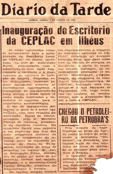 Há 57 anos atrás foi inaugurado o Escritório da CEPLAC em ILHÉUS. Era a esperança de ILHÉUS e da REGIÃO CACAUEIRA pelo desenvolvimento, trabalho e conhecimento na produção do CACAU. Não existe dúvida, a CEPLAC ajudou muito a Região a Crescer. Hoje a CEPLAC quase não existe, mas não vamos deixar de reconhecer o seu grandioso trabalho em prol do desenvolvimento do SUL DA BAHIA. Clique na foto para ampliar.