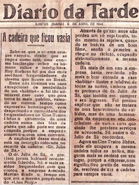3- A sensibilidade e o gesto do Sr. ARMINDO MARTINS, dono do CINE THEATRO ILHÉOS em fazer essa homenagem.