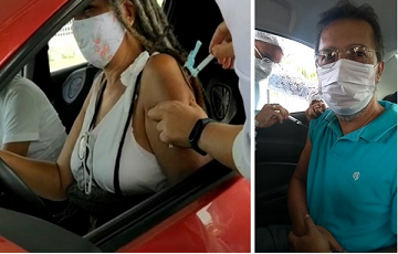 1ª Foto: MESTRE LAINHA alegre e emocionada recebendo a 2ª dose da vacina contra a COVID-19.