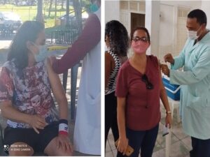2ª Foto: A funcionária da ÓTICA SAFIRA, ÂNGELA recebendo a 1ª dose da Vacina! PARABÉNS para as duas!