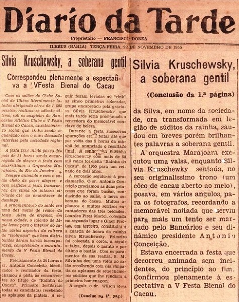 As festas promovidas pelo saudoso ANTÔNIO CONCEIÇÃO ficaram na história da vida social de ILHÉUS. ANTÔNIO CONCEIÇÃO era funcionário do BANCO DO BRASIL e foi Presidente do BANCÁRIOS ATLÉTICO CLUBE por muitos anos. SILVIA KRUSCHEWSKY, na época, uma das senhoritas mais bonitas de ILHÉUS, e tempos depois se casou com o saudoso amigo GILBERTO SABÓIA, e o casal teve vários filhos, entre eles o amigo ALCIDES KRUSCHEWSKY. Publicado no JORNAL DIÁRIO DATARDE, edição de 22 de novembro de 1955.