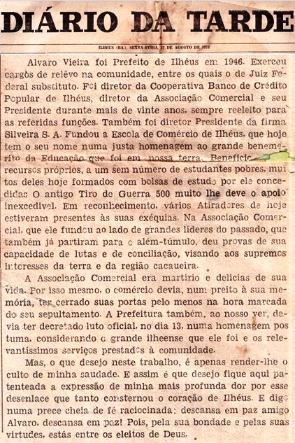 ÁLVARO MELO VIEIRA foi um dos fundadores da ESCOLA TÉCNICA DE COMÉRCIO e em sua homenagem foi colocada o seu nome. Publicado no JORNAL DIÁRIO DA TARDE, edição de 17 de agosto de 1973. Clique na foto para ampliar.