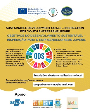 “Objetivos do Desenvolvimento Sustentável – Inspiração para o Empreendedorismo Juvenil” será o tema das palestras promovidas pela Cooperbom Turismo, nesta quarta-feira (22). A atividade gratuita começa a partir das 14h30, no auditório do Sebrae, localizado no Edifício Premier, bairro Cidade Nova, em Ilhéus. As inscrições são gratuitas e podem ser feitas no local. Mais informações pelo e-mail coorperbomturismo@gmail.com.