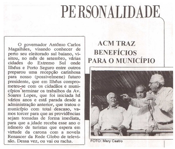 Uma das obras que ACM mandou fazer em ILHÉUS, além da RODOVIÁRIA e outras, foi o CALÇAMENTO DOS PASSEIOS DA AVENIDA SOARES LOPES COM PEDRAS PORTUGUÊSAS EM DUAS CORES. Os passeios ficaram lindos, agora se não tiver manutenção, fica difícil. Notícia acima da Revista ORIGEM, edição de Outubro/1993. Na foto aparecem: da esquerda para direita, ANTÔNIO CARLOS MAGALHÃES (Governador na época), PAULO SOUTO (Vice Governador) e ANTÔNIO OLIMPIO (Prefeito de ILHÉUS na época). Clique na foto para ampliar.