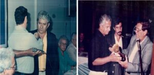 2ª Foto: ROBERTO SANTANA (Centro) recebendo o TROFÉU IMPRENSA OTÁVIO MOURA do filho do jornalista e ex. bancário OTÁVIO MOURA (lado esquerdo) e do Diretor da CDL DE ILHÉUS, o saudoso FERNANDO COSTA LINO (lado direito). (Foto: 1990).