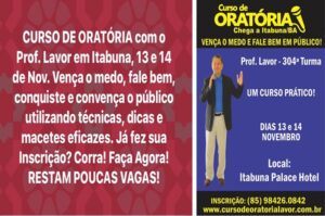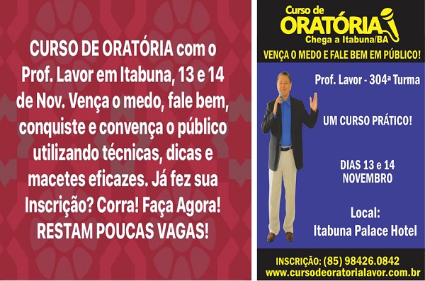 Meu amigo, meu irmão, se você pretende, no futuro, ser candidato a Vereador, Prefeito ou até mesmo Deputado, chegou a sua vez de falar Bem num Comício ou até na Televisão. Participe desse curso e depois me diga o resultado. O Problema maior é o tempo, pois o Curso começa nesse sábado (13-11-2021) às 14 horas!