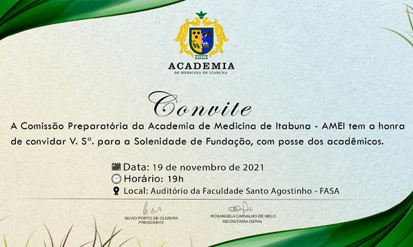 Com muita alegria comunicamos a Fundação da ACADEMIA DE MEDICINA DE ITABUNA que acontecerá nessa sexta feira (19-11-2021) às 19 horas no Auditório da FACULDADE SANTO AGOSTINHO (FASA) em ITABUNA. PARABÉNS PARA OS IDEALIZADORES! Clique na foto para ampliar.