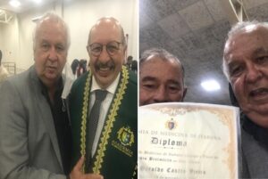 2ª Foto: SÉRGIO VIEIRA recebendo o DIPLOMA DE MEMBRO BENEMÉRITO homenageando seu pai JOSÉ HAROLDO CASTRO VIEIRA das mãos do Dr. RENATO COSTA. Clique na foto para ampliar.