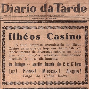 A vida noturna na cidade de ILHÉUS na década de 1930 era atuante. Se o ILHÉUS CASSINO funcionasse atualmente, seria CASA CHEIA TODOS OS DIAS. Para falar a verdade, não existe VIDA NOTURNA em ILHÉUS. Matéria publicada no Jornal DIÁRIO DA TARDE de ILHÉUS, edição de 15 de junho de 1935.