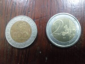 Na foto acima: Lado esquerdo, uma moeda de ESCUDO e uma moeda de 2 EUROS.