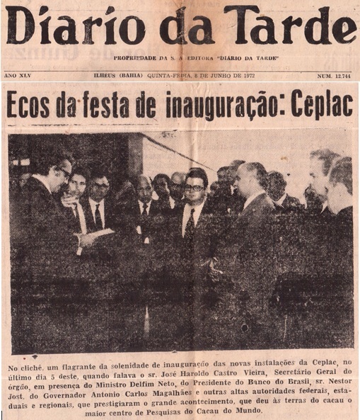 E foi assim a inauguração do CENTRO DE PESQUISAS DO CACAU (CEPLAC), com muitas autoridades presentes. Leia a notícia na foto acima divulgada no JORNAL DIÁRIO DA TARDE, edição de 08-06-1972, 50 anos atrás.