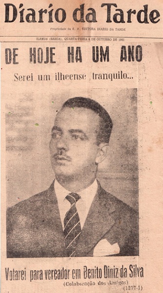 BENITO DINIZ, funcionário exemplar da Prefeitura Municipal de ILHÉUS e de família tradicional. Foi candidato a Vereador nas eleições de 1962. Notícia publicada no Jornal DIÁRIO DA TARDE, edição de 04 de outubro de 1961. Clique na foto para ampliar.