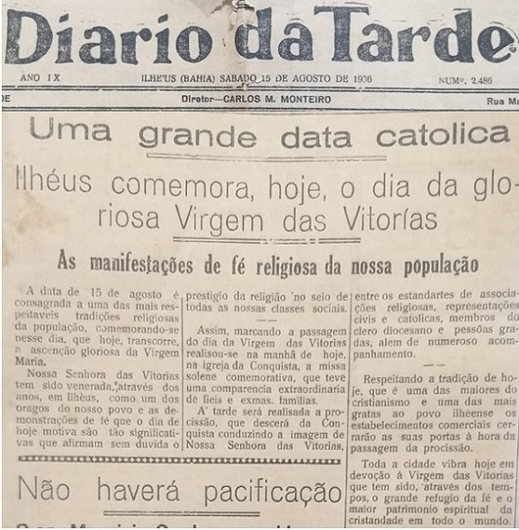 Nesse dia 15 de agosto, ILHÉUS comemora uma das datas religiosas mais importantes da Cidade, é o dia da Padroeira NOSSA SENHORA DAS VITÓRIAS. Leia a matéria acima publicada no DIÁRIO DA TARDE, edição de 15 de agosto de 1936 (86 anos atrás). Clique na foto para ampliar.