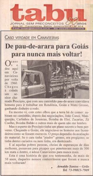 Esse fato narrado por ARNALDO SANTOS (GRILO) não foi o único, aconteceu em CANAVIEIRAS e em várias cidades do NORDESTE BRASILEIRO. Foram milhares de NORDESTINOS que foram vendidos como escravos e principalmente, para o NORTE (PARÁ e AMAZONAS) e nunca mais voltaram a sua TERRA NATAL. Graças a DEUS, JOSÉ LEITE saiu do CEARÁ para a BAHIA e se deu muito bem. Notícia publicada no JORNAL TABU, edição de janeiro de 2018.
