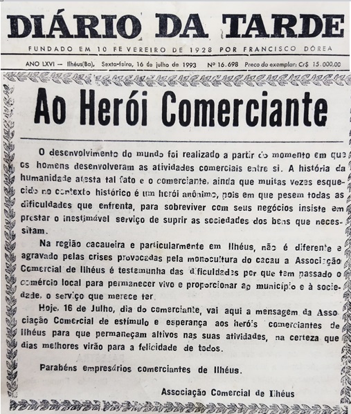 O dia 16 de julho é quando se comemora o dia em HOMENAGEM AO COMERCIANTE, mas JOSÉ LEITE acha que todos os dias são dias desses abnegados do Comércio com essa carga Tributária, aluguéis e principalmente, quando chove nas ruas principais do Comércio de ILHÉUS. É uma questão de sobrevivência. SÓ DEUS SALVA! Matéria tirada do Jornal DIÁRIO DA TARDE, edição de 16-07-1993. Clique na foto para ampliar!
