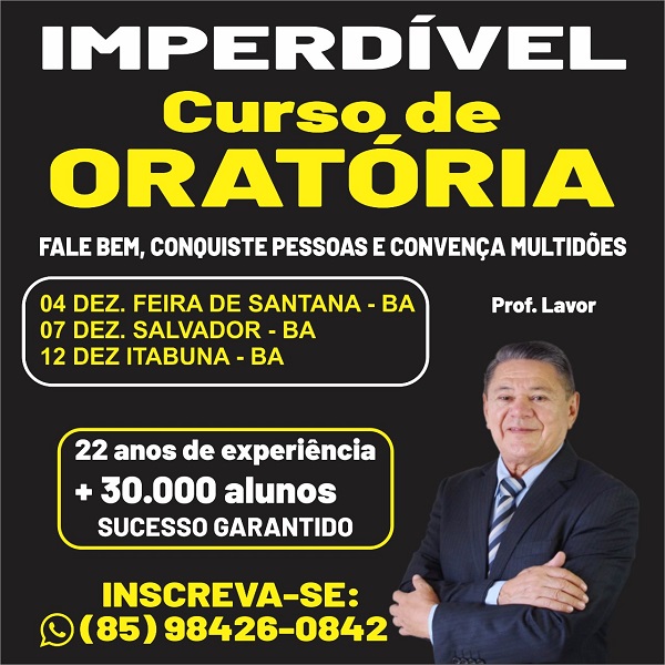 Mais um CURSO DE ORATÓRIA será realizado na cidade de ITABUNA no próximo dia 12 de dezembro, e será ministrado pelo competente professor LAVOR. NÃO PERCA TEMPO, INSCREVA-SE JÁ! Clique na foto para ampliar!