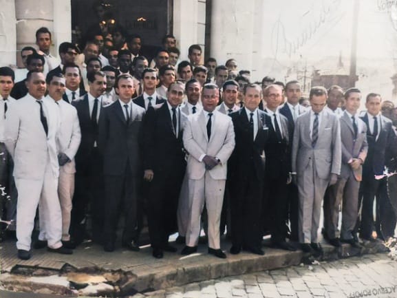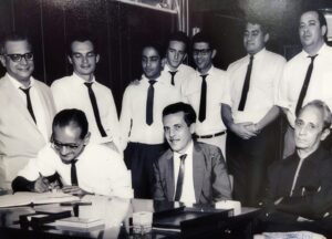 Outra foto com membros dos setores e gerencias. De pé: MIGUEL RABAT, ALOÍSIO REIS, ALMIR FREITAS e OSDEVAL. Sentado, o Gerente SEU VARANDAS. Clique na foto para ampliar.Assinatura da compra do Terreno na Rodovia ILHÉUS/OLIVENÇA para a construção da Sede da AABB. Sentados: Da esquerda para direita: EDSON REGO (Presidente da AAB), RENATO (Gerente da ag. BB), Sr. CORREIA (Proprietário Vendedor). De pé: Da esquerda para direita: ALOÍSIO REIS, JUVENAL, JOSÉ JORGE, MALAGUTE, MIGUEL RABAT, PEDRINHO e ARMANDO OLIVEIRA. Clique na foto para ampliar.