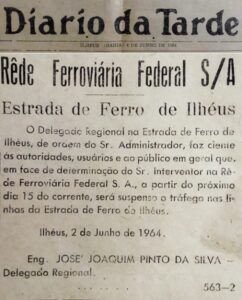 Um dos avisos mais tristes acontecidos na Cidade de ILHÉUS foi o da foto acima suspendendo o Tráfego das LINHAS DA ESTRADA DE FERRO DE ILHÉUS, deixando centenas de pais de Família sem Emprego. Notícia publicada no Jornal DIÁRIO DA TARDE, edição de 04 de junho de 1964. Clique na foto para ampliar.