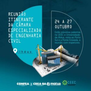 A Câmara Especializada de Engenharia Civil do Crea-BA desembarcará em Ilhéus no período de 25 a 27 e outubro para realizar sua primeira reunião itinerante de 2024. Na ocasião, serão realizadas palestra sobre mobilidade urbana na Bahia e ações previstas para a região de Ilhéus/ Itabuna, reunião com inspetores, profissionais e estudantes, além de visitas técnicas a Bahia Mineração e a Ponte Jorge Amado Ilhéus – Pontal.