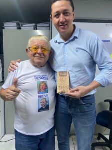 José Leite e o Prefeito de Juazeiro do Norte, Gledson Bizerra, recebendo um chocolate YRERÊ com fábrica em Ilhéus e um dos melhores da Bahia e do Brasil. Foto 16-10-2023.