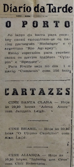Na década de 1960, o JORNAL DIÁRIO DA TARDE publicava nas suas edições diárias, os Anúncios dos FILMES e os NAVIOS chegados no PORTO ANTIGO e os que ficavam fora da BAIA DO PONTAL. No aviso acima, os dois primeiros navios ficavam no Largo da Barra, os Navios Ingleses CRISPIN e SPENSER ficavam ancorados no PORTO ANTIGO. O CINE BRASIL ficava onde hoje é a Igreja Universal do Reino de Deus na Rua Tira Dentes. O CINE ALIANÇA ficava num Prédio na Rua Arthur Lavigne, no bairro da Conquista. Notícia publicada no Jornal DIÁRIO DA TARDE, edição de 03 de janeiro de 1966. Clique na foto para ampliar.