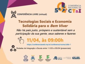 A Conferência Livre é uma iniciativa da Universidade Federal do Sul da Bahia – UFSB, por meio de sua Incubadora de Tecnologias Sociais e Economia Solidária do Sul e Extremo Sul da Bahia – ITESBA, vinculada à Pró-reitoria de Extensão e Cultura – PROEX/UFSB, em parceria com docentes da UESC, do IFBA Campus de Ilhéus, e do IFbaiano de Uruçuca. O evento on-line está programado para ocorrer no dia 11 de abril de 2024, a partir das 09h, com expectativa de participação da comunidade universitária e da comunidade externa do Sul e Extremo Sul da Bahia.