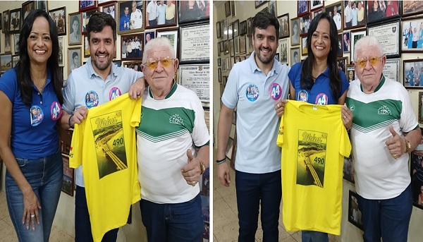 Visitas ilustres nessa última quarta-feira (21-08-2024). Os candidatos para Prefeito e Vice-Prefeita: VALDERICO JÚNIOR e WANESSA GEDEON. Sucesso nessa linda Caminhada. Nas fotos: JOSÉ LEITE presenteando os dois com uma camisa dos 490 anos de ILHÉUS. Clique na foto para ampliar.