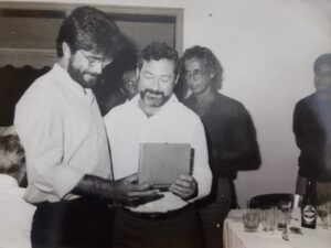 Na foto, o saudoso Presidente MOISÉS BOHANA homenageando o Diretor da TV SANTA CRUZ, NESTOR AMAZONAS. Também aparecem na foto TONI NETO e GENILTON GALVÃO. Foto: Final da década de 1980. Clique na foto para ampliar.