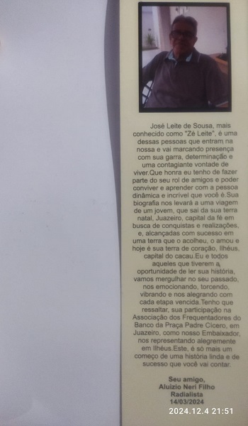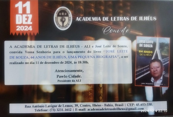 JOSÉ LEITE escolheu essa data (11-12-2024) para o Lançamento do seu Livro, em homenagem ao amigo Escritor JOÃO CALAZANS FILHO porque é nessa mesma data que a ACADEMIA BRASILEIRA DE LETRAS irá escolher o substituto do Escritor e Poeta ANTÔNIO CÍCERO e JOÃO CALAZANS é um forte candidato! JOÃO CALAZANS é Autor de 51 Livros, tem suas obras publicadas em 10 idiomas em mais de 160 países. JOÃO CALAZANS tem forte ligação com a cidade de ILHÉUS, porque foi um dos organizadores do 1º Triátlon Internacional acontecido na TERRA DE SÃO JORGE DOS ILHÉUS. Vamos torcer pela Vitória de JOÃO CALAZANS FILHO! Clique na foto para ampliar.