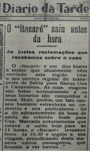 O Navio ITACARÉ que naufragou na entrada da Baia do Pontal no dia 23 de agosto de 1939, sempre deu problema, leia a notícia acima. Notícia do Diário da Tarde, edição de 06 de outubro de 1938 menos de um ano do seu Naufrágio. Clique na foto para ampliar.
