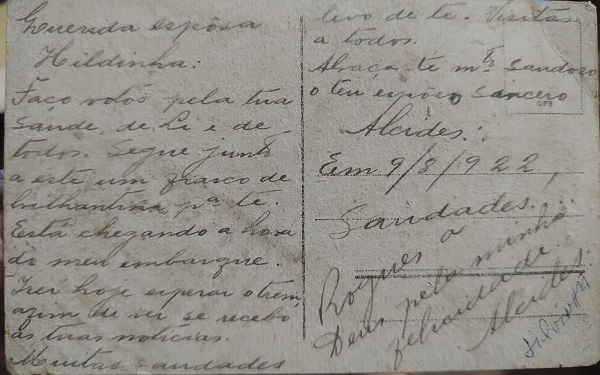 Faço votos para tua saúde, de Li e de todos. Segue junto a este, um frasco de Brilhantina para ti. Está chegando a hora do meu embarque. Irei hoje esperar o Ter, afim de ver se recebo as tuas notícias. Muitas saudades levo de ti. Visitas a todos. Abraça-te, muito saudoso, o teu esposo sincero ALCIDES. Em 9-08-1922. Saudades… Rogue a DEUS pela minha Felicidade. ALCIDES.”