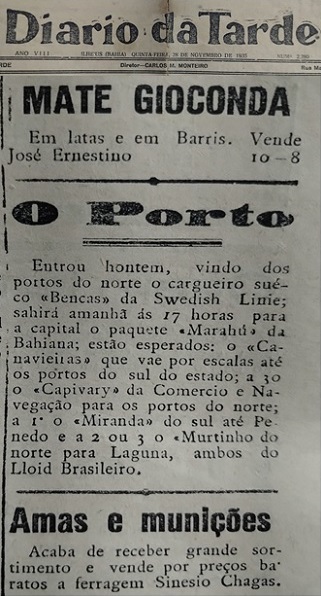 Notícia do PORTO DE ILHÉUS há 90 anos atrás. A Loja de Ferragens de SENÉSIO CHAGAS funcionava no Prédio do SHOPPING IT’ART, na Rua Dom Pedro II, esquina com a Ernesto Sá. Notícia Publicada na edição de 28 de novembro de 1935 do Jornal DIÁRIO DA TARDE. Clique na foto para ampliar.