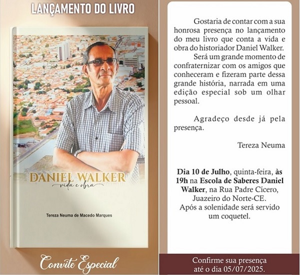 Muito feliz pelo lançamento do Livro da amiga TEREZA NEUMA, mas triste por não poder está presente no lançamento. Mas em breve estarei em JUAZEIRO DO NORTE para adquirir meu exemplar dessa obra sobre a vida do meu saudoso e querido amigo historiador DANIEL WALKER. Clique na foto para ampliar.