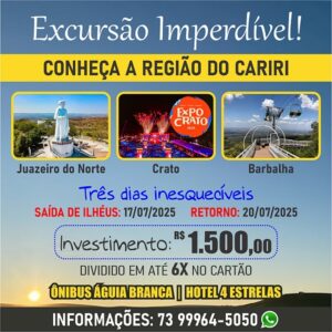 Está perto!! A maior e melhor excursão de ILHÉUS para JUAZEIRO DO NORTE, três dias inesquecíveis. Clique na foto para ampliar.