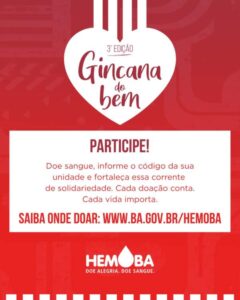 A Fundação Hemoba realiza, pelo terceiro ano consecutivo, a Gincana do Bem, ação que mobiliza profissionais de saúde de hospitais e maternidades de Salvador para doação de sangue. A campanha segue até o dia 5 de dezembro e integra as atividades da Semana Nacional do Doador de Sangue, que acontece de 24 a 29 de novembro. O objetivo da iniciativa é estimular o sentimento de corresponsabilidade entre os profissionais da área da saúde e incentivar familiares e amigos a participarem do gesto solidário de doação de sangue, fortalecendo a cultura da doação e ampliando o número de doadores regulares ao longo do ano.