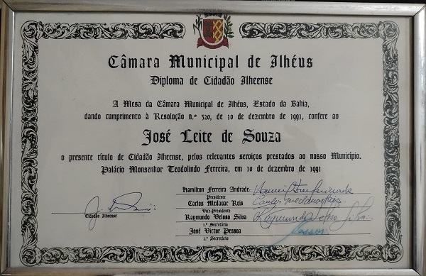 2) O TÍTULO DE CIDADÃO ILHEENSE PARA JOSÉ LEITE DE SOUZA.
