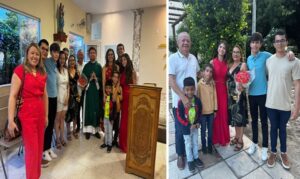 1ª Foto: Família reunida com o Padre depois da celebração da missa dos 50 anos de casados.