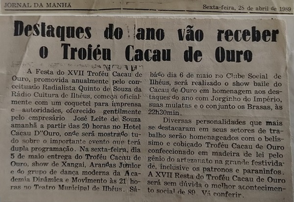 O saudoso amigo Radialista QUINTO DE SOUZA, todos os anos promovia a “FESTA CACAU D’OURO”. E foram quase 50 ANOS DE FESTA para premiar as EMPRESAS DESTAQUES DO ANO. Em 1989, ano que o HOTEL CACAU D’OURO foi inaugurado (01-01-1989) não foi diferente, a Direção do Hotel promoveu um Coquetel para a apresentação da festa que foi realizada no dia (06-05-1989). Matéria do JORNAL DA MANHÃ, edição de 25-04-1989. Clique na foto para ampliar.