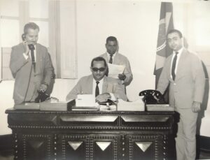 JOÃO ALFREDO AMORIM DE ALMEIDA, Prefeito de ILHÉUS, ladeado por assessores. No lado esquerdo, Chefe de Gabinete PEDRO FARIAS, o popular PAI PEDRO. Foto: década de 1960. Clique na foto para ampliar.