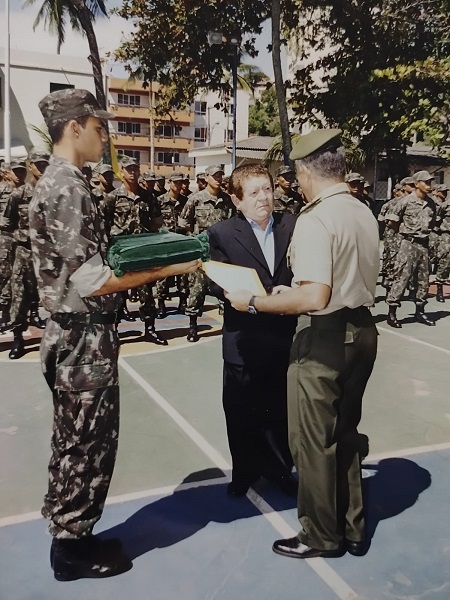 Quando a 18ª CSM do EXÉRCITO estava ativa na cidade de ILHÉUS. JOSÉ LEITE recebendo o Diploma de AMIGO DA 18ªCSM. Na foto, aparecem JOSÉ LEITE e o Chefe da 18ª CSM, Cel. HUMBERTO DE SOUZA MELLO NETO. Foto: 25-08-2004. Clique na foto para ampliar.