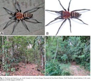 Uma aranha encontrada dentro de uma sala. Fato comum, ainda mais em uma universidade próxima da Mata Atlântica, como é o caso da Universidade Federal do Sul da Bahia (UFSB). Mas, no caso em questão, esse achado rendeu uma descrição de espécie antes desconhecida: a Trechona garimpeira. A novidade consta do artigo A new species of Trechona C. L. Koch 1850 from Northeast Brazil (Araneae: Mygalomorphae: Dipluridae) [Uma nova espécie de Trechona C. L. Koch 1850 do Nordeste do Brasil (Araneae: Mygalomorphae: Dipluridae)]. O estudo é assinado por Gabriel Wermelinger-Moreira e Renner Luiz Cerqueira Baptista, do Laboratório de Diversidade de Aracnídeos da Universidade Federal do Rio de Janeiro (UFRJ), Beatriz Vitória Siqueira Lemos e Felipe Micali Nuvoloni, do Laboratório de Ecologia Animal e Genômica Ambiental da Universidade Federal do Sul da Bahia (UFSB). O artigo foi publicado no periódico Acta Arachnologica, volume 74, número 2, em dezembro de 2025.
